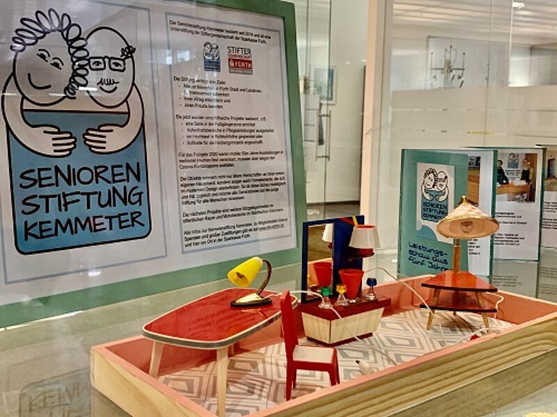 Für das Frühjahr 2020 waren mobile Ausstellungen zum Thema "Die 50er Jahre" in mehreren Heimen fest vereinbart. Die Vorbereitungen waren abgeschlossen, alles stand bereit. Leider musste die Ausstellung aber wegen der Corona-Kontaktsperre ausfallen. Jetzt sind die Vitrinen in der Kundenhalle der Sparkasse Fürth in der Maxstraße zu sehen. Die ausgestellten Objekte erinnern nicht nur die älteren Mitbürgerinnen und Mitbürger unter uns an ihren ersten eigenen Hausstand, sie zeigen auch Formelemente, die sich im modernen Design wiederfinden. So ist diese Schau nostalgisch und hip zugleich und möchte alle Generationen auf die junge Stiftung für alte Menschen hinweisen.