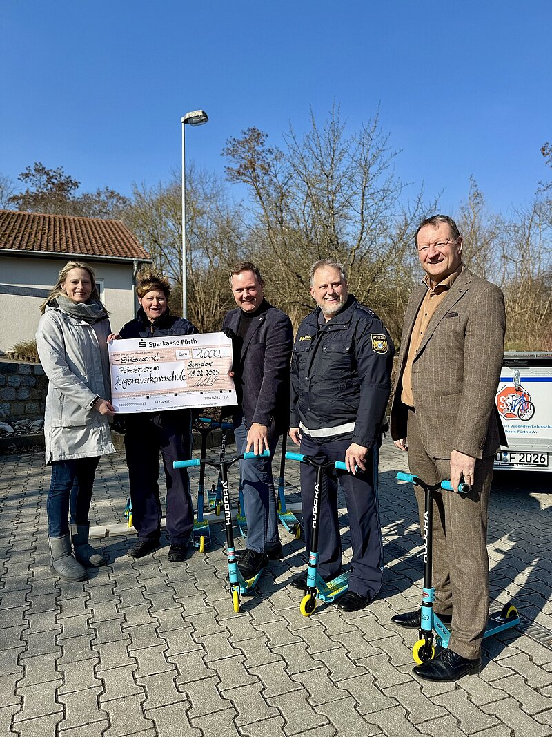 Der Förderverein der Jugendverkehrsschule im Landkreis Fürth hat deshalb zehn Scooter angeschafft, die Schulen im Landkreis nnun kostenlos ausleihen können. Damit wird eine wichtige Grundlage geschaffen, um Kindern frühzeitig sicheres Verhalten im Straßenverkehr beizubringen. Die Anschaffung der Roller wurde durch eine Spende von insgesamt 1.000 Euro ermöglicht. Die Mittel stammen von der Michael Egelseer-Stiftung. Dank dieser Unterstützung kann die Verkehrserziehung an den Grundschulen praxisnah erweitert werden – ein wichtiger Schritt für die Sicherheit der jüngsten Verkehrsteilnehmer. Landrat Bernd Obst bedankte sich für die Spende bei der symbolischen Scheckübergabe.