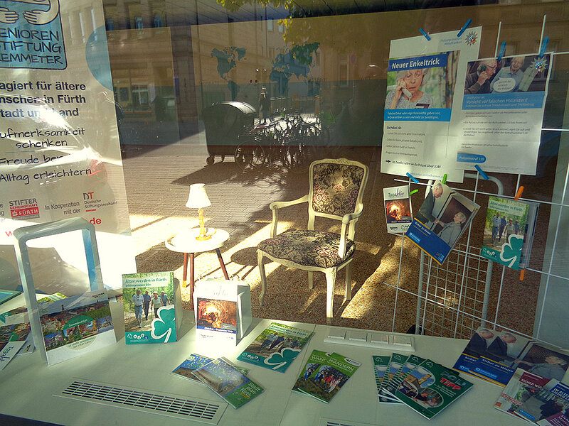 Die Anmutung einer gemütlichen Lese-Ecke mit Barockstuhl, Teppich und Tischleuchte und der Werbe-Roll-up der Seniorenstiftung Kemmeter tragen dazu bei, die Ziele der Stiftung zu realisieren: alten Menschen in Fürth Stadt und Land Aufmerksamkeit zu schenken, ihren Alltag zu erleichtern und ihnen Freude zu bereiten.