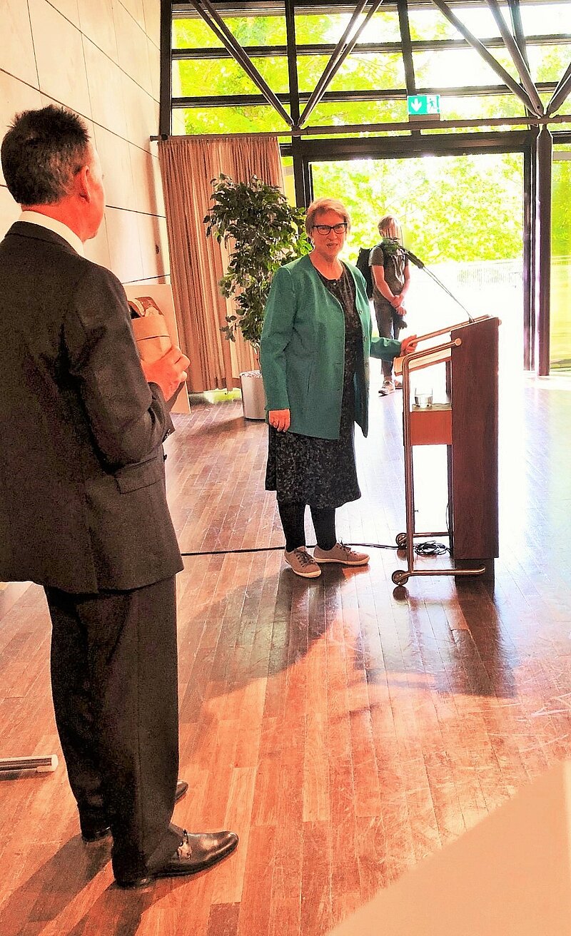 Eine Anerkennung im Rahmen des Zukunftspreises bekam in diesem Jahr das gemeinsame Projekt InnenStadt der Seniorenstiftung Kemmeter und des Städtischen Altenpflegeheims. Um was geht es? Die Bewohnerinnen und Bewohner eines Altenpflegeheims sind meist nicht mehr in der Lage, sich selbständig und sicher draußen in der Stadt zu bewegen. Umgeben von Sessel, Bett und Tisch fehlen ihnen die vielseitigen Reize der vertrauten städtischen Umwelt. Das Projekt InnenStadt holt die Stadt ins Heim hinein; sie ist eine Stadt innen in einem Heim. Wie soll das umgesetzt werden? Durch Umgestaltung des vorhandenen Raumangebots mit Stadtansichten z.B. auf Fototapeten und mit Kulissenbauten, die eine Ladenzeile mit Geschäften, einem Café, Straßenlaternen, Bänken etc. darstellen. Ziel ist es, dass ältere Menschen in einer behüteten Atmosphäre ihre "Stadt" begehen und erleben, sich dort mit Mitbewohnerinnen und Mitbewohnern verabreden und mit ihnen gemeinsam das anregende Ambiente genießen können. Auch Besucherinnen und Besucher können die Attraktion gerne mit Eltern und Großeltern teilen, damit werden Austausch und Begegnung nachhaltig gefördert. Die InnenStadt ist geeignet, den Menschen in Heimen einen lebenspraktischen Mehrwert zu schenken und vielleicht sogar eine dementiell verengte Sicht für ein paar Momente etwas zu weiten. Bis jetzt besitzt das Städtische Altenpflegeheimheim eine Bildwand mit Stadtparkblick, baut eine Motivecke mit Mastleuchte und plant eine Promenade unter Laternen mit Ausblick auf den realen Gartenbereich. Mit der Anerkennung im Rahmen des Zukunftspreises hoffen den Initiatoren, die Seniorenstiftung Kemmeter und das Städtische Altenpflegeheim, auf Nachahmer und Unterstützer bei der fachlich-gestalterischen Begleitung, den handwerklichen Arbeiten und natürlich bei der Materialbeschaffung.