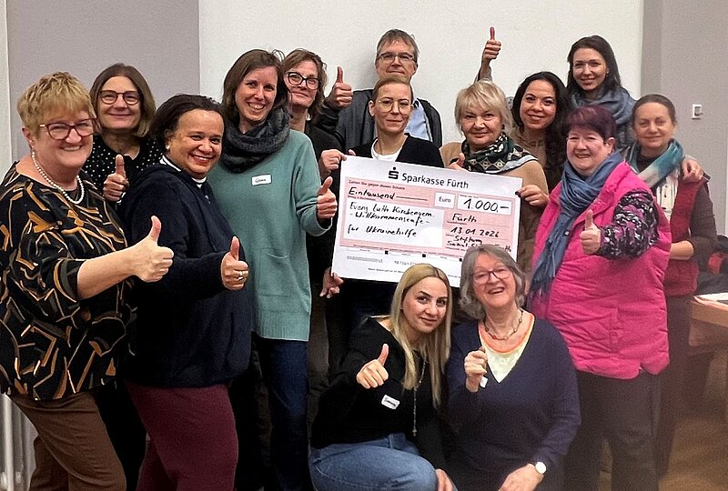 Organisiert wird das Café von einem engagierten Team von Ehrenamtlichen. Die Stiftung Sozial.Stark.Fürth in der Stiftergemeinschaft der Sparkasse Fürth hat eine Spende an sie für die Ukraine-Hilfe um 25 % aufgestockt und den Scheck an das Team des Willkommenscafés Fürth übergeben.