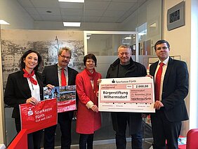 Anlässlich der Eröffnung der neuen Geschäftsstelle der Sparkasse Fürth in Wilhermsdorf wurde eine exklusive Einkaufstasche aufgelegt und verkauft. So kamen 1.036 Euro zusammen, die jetzt von der Sparkasse Fürth auf 2.000 Euro aufgerundet wurden. Die Summe wurde am 25. November an die Bürgerstiftung Wilhermsdorf übergeben und soll für soziale Projekte in der Region verwendet werden.
